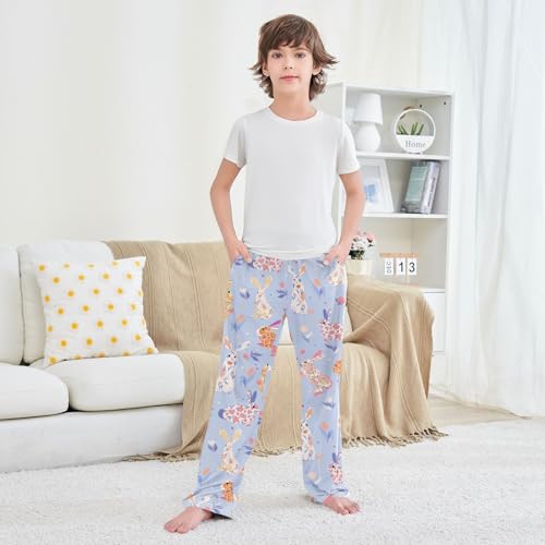Floral Bunny Boys Long Pants silky Trousers Elastic Waist Kids Lounge Bottoms with Pockets S-XL