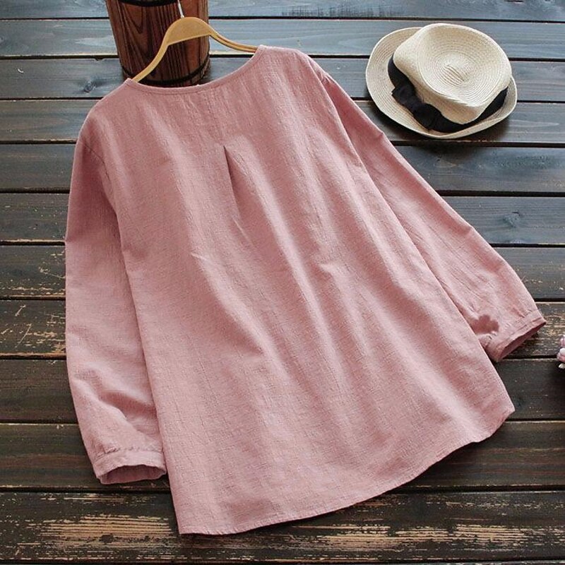 Highlights [Fabric] : Crafted with a blend of cotton and linen, this blouse offers a breathable and lightweight feel, perfect for keeping cool and comfortable in spring and fall. [Fit] : Designed in a regular fit, this blouse features a loose silhouette, providing ease of movement and a relaxed yet stylish appearance. The inelastic fabric ensures a structured and elegant look. [Design Highlights] : This shirt showcases a classic shirt collar with a button-down front, allowing for versatile styling. The long sleeves are finished with lightly gathered cuffs, contributing to its fashionable appeal. Available in solid colors such as pink, navy blue, yellow, and white, it radiates timeless elegance. [Occasions] : Ideal for both street and daily wear, this blouse easily transitions from casual outings to more polished settings. Pair it with jeans or skirts for a chic and effortless everyday outfit. [Size Range] : Available in a wide range of sizes, from M to 5XL, ensuring a suitable fit for a variety of body types and preferences.