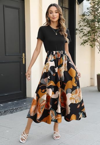 Women’s Floral Print Elastic High Waist Skirts Elegant A-Line Boho Flowy Swing Long Maxi Skirts 6