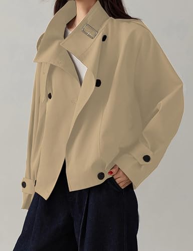 HOT ! Womens Cropped Trench Coats Double Breasted Long Sleeve Stand Collar Oversized Trendy Jackets