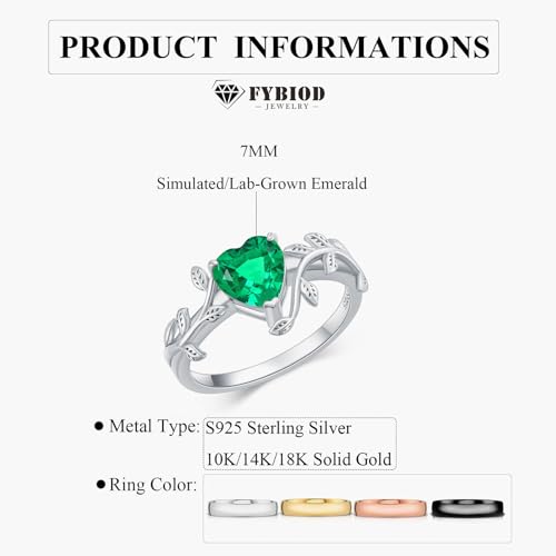 • Leaf Design: Emerald is known for its rich green color and brilliance, and emerald is the birthstone of May. This women's ring features a heart shape green emerald in prong setting set as a solitaire in the center. The emerald ring features vine leaf design, showing women’s ingenious personality and style