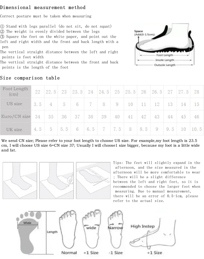 3. Please read our shoe size table carefully! It can help you choose the right size for your feet. If you have any other questions, please contact our customer service first, we will help you solve. Please note that if your feet are too long or too wide, choose a larger size than usual.