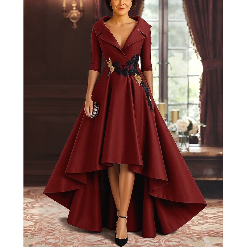 More information about Red Black A-Line Mother of the Bride Dress Elegant High Split Shirt Collar Asymmetrical Satin 3/4 Length Sleeve with Appliques 2025