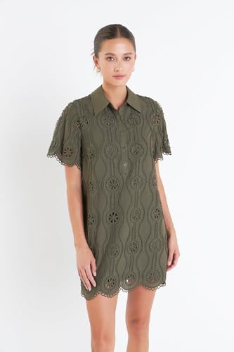 • Discover the captivating blend of textures in the English Factory Women's Scallop Embroidered Cotton Mini Shirt Dress