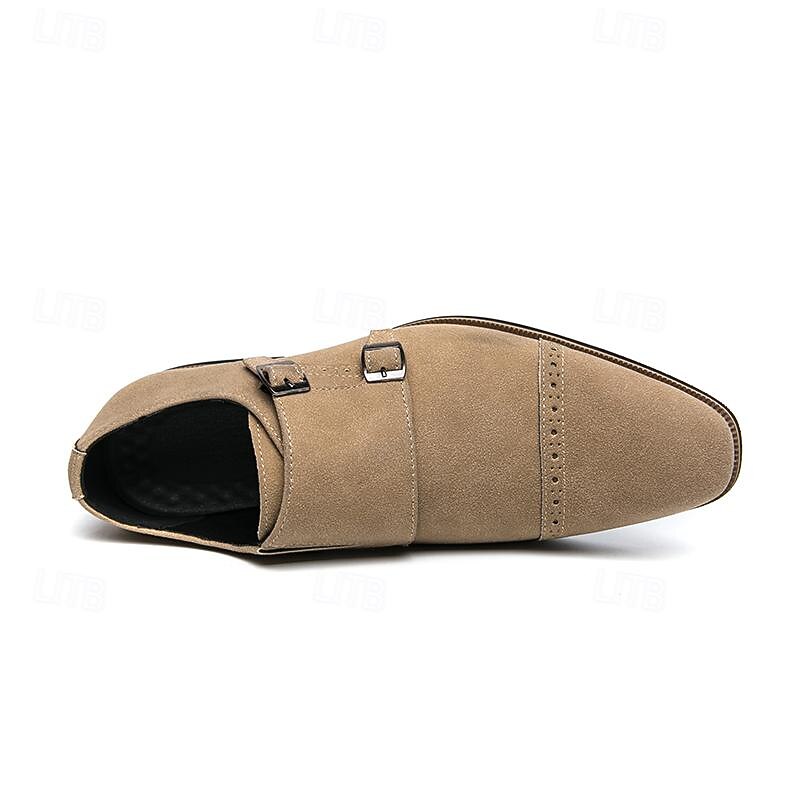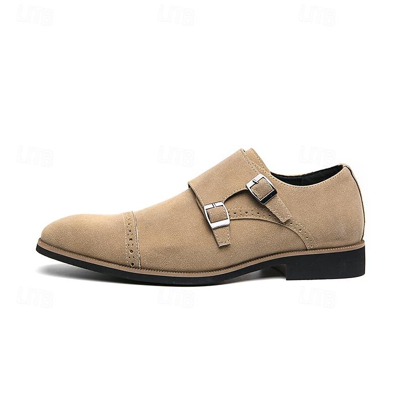 HOT ! Men's Beige Suede Double Monk Strap Dress Shoes – Elegant Brogue Detailing for Formal and Semi-Formal Occasions