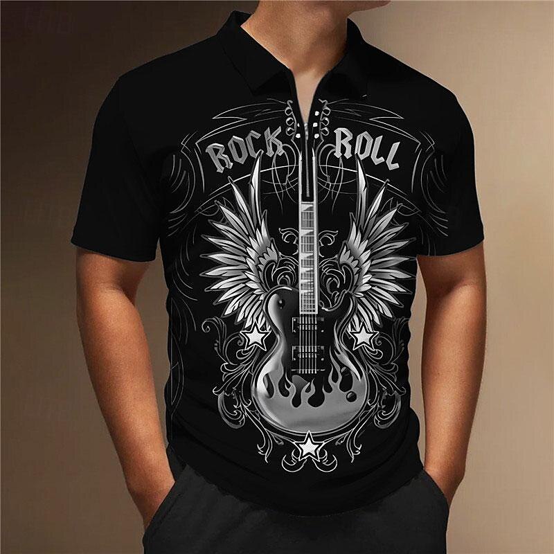 HOT ! Music Festival Men's Guitar Zip Polo Shirts Golf Shirt Short Sleeve Polo Shirts Collared Shirts Casual Vacation Wear Festival Wear Party Outfits 3D Print Quarter Zip Polo Black Red Gray