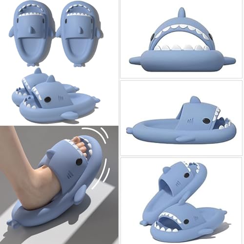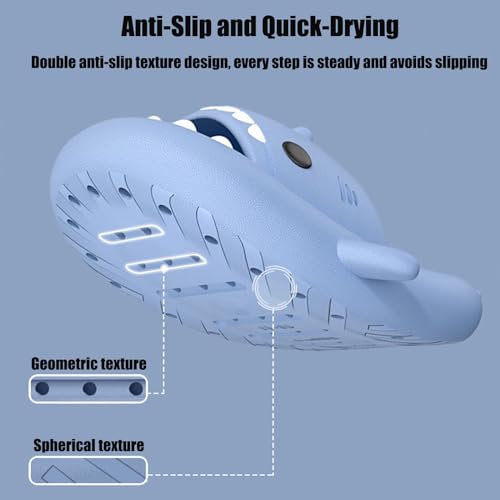High-Quality Material: Shark Slippers made of high-density premium EVA material, these slippers are durable, lightweight, soft, and water-resistant. The open toe design is very breathable, so you don't have to worry about your feet getting hot and sweaty.Cute Shark Slides: Cute cartoon shark slippers, the whole slipper is shaped like a shark, and the toe cap has two rows of white teeth. distinctive open toe design will make the shark's mouth open and close when you walk, fashion and intersting.Anti-collision Design: Shark sandals have a concave sole design to protect your toes from kicking against table legs or door sills. The thick cushioning outsole provides exceptional comfort.Slightly upturned 15Β° from toe to tail, the fit angle balances pressure, so you wear a long time is not tired feet.No-Slip & Quick-Drying: The bottom of the bathroom slippers has a good grip to prevent you from slipping on wet surfaces. The upper is easy to wipe and clean. It dries quickly to keep your feet dry after showering or swimming.Wide Range of Applications: These kids shark shoes are perfect for any casual occasion, whether you are at the beach, shower, on vacation, camping or by the pool, the shark slide is perfect for any indoor outdoor activity. Perfect for everyday use. premium materials and excellent craftsmanship ensure long-lasting durability.