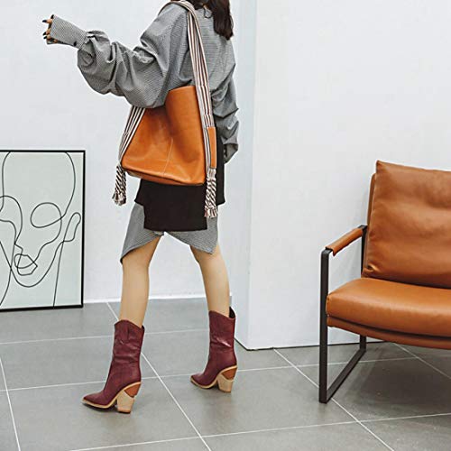 VOKLIN Women's Western Cowboy Chelsea Ankle Boots Pointed Toe Pull On Chunky Stacked High Heel Riding Booties 5