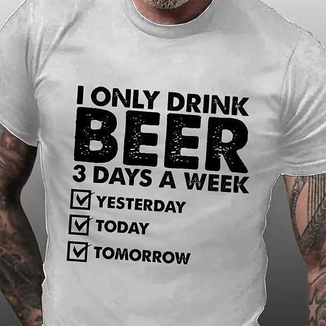 Highlights [Fabric] : Crafted from 100% cotton, this men's T-shirt ensures a soft, breathable, and durable experience, making it ideal for everyday wear across various seasons like spring and summer. [Fit] : Designed with a regular fit, this classic crew neck style features short sleeves, providing a versatile and casual look suitable for a range of activities, from street style to outdoor sports. [Design Highlights] : The T-shirt showcases a humorous slogan "I Only Drink Beer 3 Days a Week: Yesterday, Today, Tomorrow" in bold, eye-catching letters. Available in white, black, and dark blue, the contrasting print stands out for a playful and engaging fashion statement. [Occasions] : Perfect for casual outings, sporting events, and street activities, this tee suits those who appreciate witty and lighthearted apparel. It's an excellent choice for anyone looking to express personality and humor through their fashion. [Size Range] : Available in sizes S through XXL, this T-shirt accommodates a wide range of body types, ensuring a comfortable fit for adults seeking both style and comfort in their everyday wardrobe.
