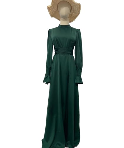 HOT ! xxxiticat Women's Green Satin Dress Long Lantern Sleeve Mock Neck Puff Shoulder Tie Waist Pleated Cocktail Maxi Slip Dresses