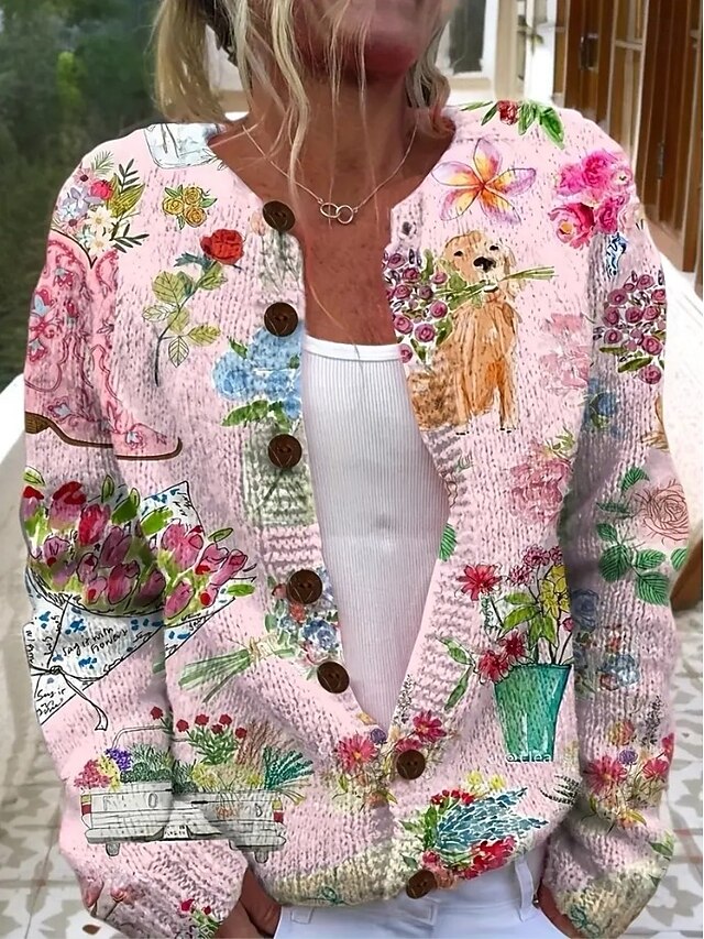 Women's Cardigan Sweater Knitted Ribbed Button Front Round Neck Long Sleeve Lightweight female Daily Animal Crew Neck Buttons Print Long Tops Knit Outdoor Weekend Pink Fall Winter 1