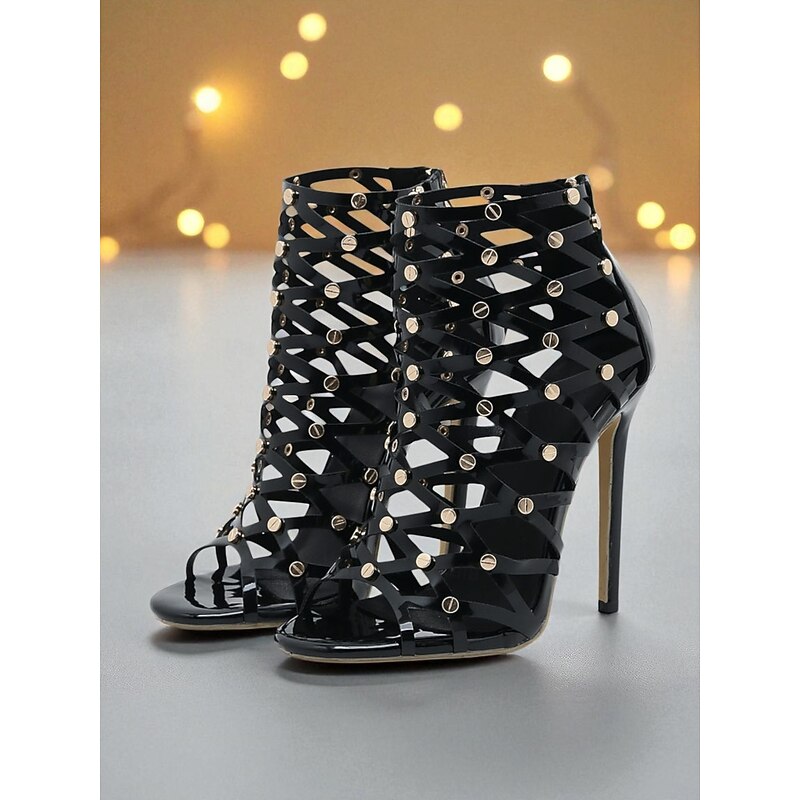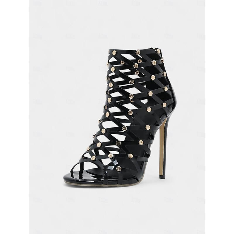 Women's Black Gladiator High Heel Sandals, Peep Toe Stiletto Party Shoes with Studded Straps for Nightlife Club and Evening Outfits 1
