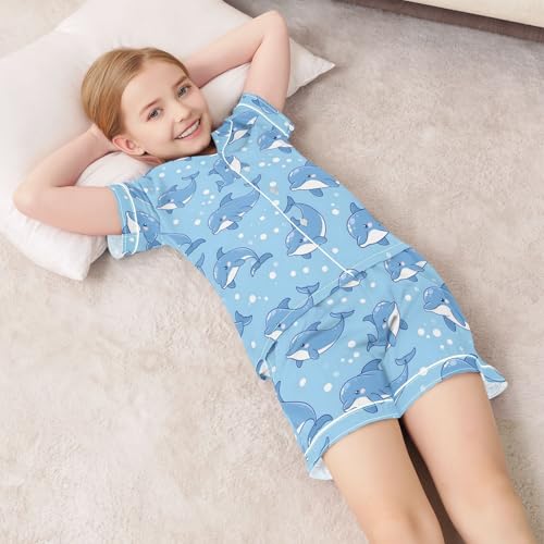 HOT ! ALAZA Cute Dolphin Bubble Blue Satin Pajamas Set Short Sleeve Button Down Sleepwear Summer Pjs 2 Piece
