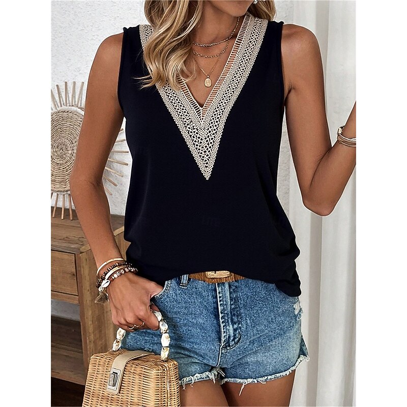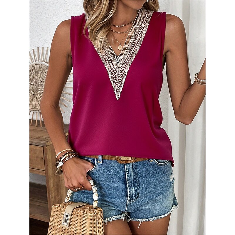 Why Choose Women's Summer Tops Blouse Plain chic Casual Sleeveless V Neck Regular Tops Daily Holiday Patchwork Lace Trim Black White Wine Green Summer?