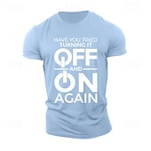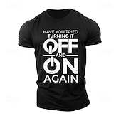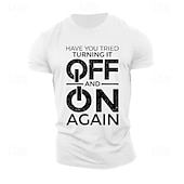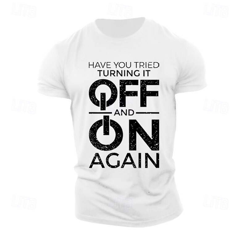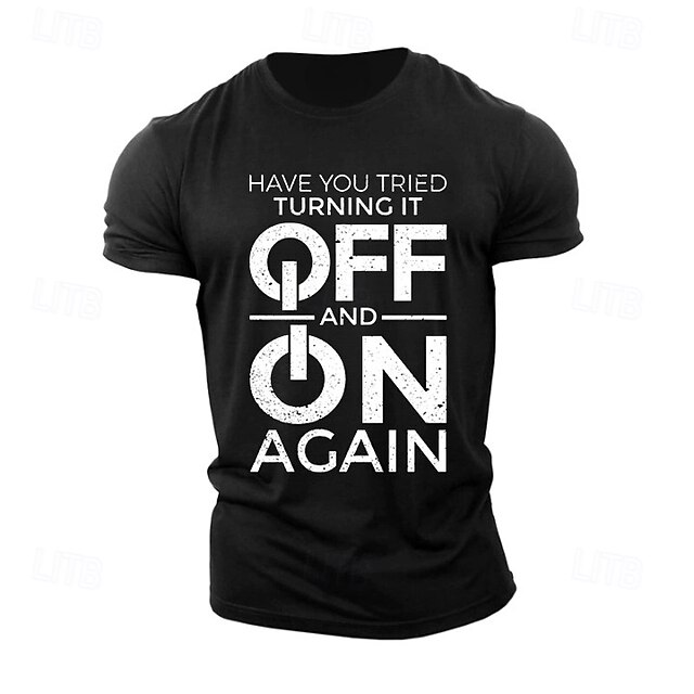 Highlights [Fabric:] Crafted from 100% high-quality cotton, this men's T-shirt ensures a soft, breathable, and comfortable wear. The micro-elastic fabric provides just the right amount of stretch for flexibility and ease of movement. [Fit Type:] Featuring a regular fit, this T-shirt offers a balanced silhouette that accommodates various body shapes, ensuring a timeless and flattering look. [Design Highlights:] The T-shirt showcases a classic crew neck and short sleeves, adorned with a bold letter-printed slogan: "Have You Tried Turning It Off and On Again." The striking white print on a black background delivers a modern and humorous edge, perfect for tech enthusiasts. [Occasions:] Ideal for casual outings, sports, or outdoor street activities, this versatile T-shirt is suited for numerous scenarios. Whether you're engaging in sports, enjoying a relaxed weekend, or hanging out with friends, it adds a touch of humor and style to your wardrobe. [Size Range:] Available in a wide range of sizes from S to XXL, the T-shirt ensures a perfect fit for adults of different builds.