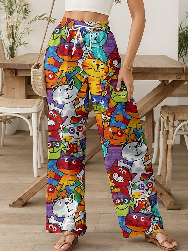 Women's Wide Leg Chinos Baggy Pants Vacation Vintage Fashion Full Length High Waist Graphic Animal Cat Printing Soft Breathable Micro-elastic Formal Outdoor Vacation Yellow Red Blue Purple Summer 7