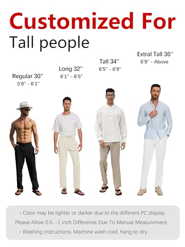 Fabric type: 50%Rayon, 20%Linen, 20%Nylon, 10%PolyesterCare instructions: Machine WashOrigin: ImportedClosure type: Zipper【4 Inseam Lengths】Men’s casual linen pants feature with four inseam lengths suitable for tall people: Regular: 30 inseam fits men 5'9 - 6'1 / Long: 32 inseam fits men 6'1 - 6'5 /Tall: 34 inseam fits men 6'5 - 6'9/ Extra Tall: 36 inseam fits men above 6'9. Please check the size chart before buying for your right length of pants.【Comfy Fabric】The men's linen pants are made from linen-blend fabric, Durable Quick dry. With Soft, Lightweight and Breathable and Sweat-Absorbent, keep you cool all day and are ideal choices for comfortable daily wear, summer wear, beachwear, holiday wear, and workwear. Pre-washed makes it shrink-controlled.【sophisticated Design】Beach pants for men has a elastic waistband with adjustable drawstring for a custom fit, zip fly with button closure and straight-legs Trousers. Two slant pockets and back pockets to provide convenient space for your essentials. loose fit cut, solid color, bring you all day comfort.【Variety Matches】Mens casual pants are a versatile and stylish addition to any man’s wardrobe. Create a more modern look, you can try these Men's summer pants with loose fit casual shirts or a white t-shirt, vest, hawaiian shirts, sneakers, sandal, canvas shoes, flip flops and so on. Perfect gift for father, son, husband, friend and boyfriend.【For All Occasions】Linen pants for men are perfect for daily wear, great for vacation, traveling, beach wedding, streetwear, lounging, leisure at home, going out, party, yoga, jogging, party, office, work, school, etc. great for hot summer days also suitable for Spring and Fall. Garment Care: These linen trousers are gentle machine washable. Air dry it on a line or rack, do not tumble dry. Perfect for everyday use. premium materials and excellent craftsmanship ensure long-lasting durability.