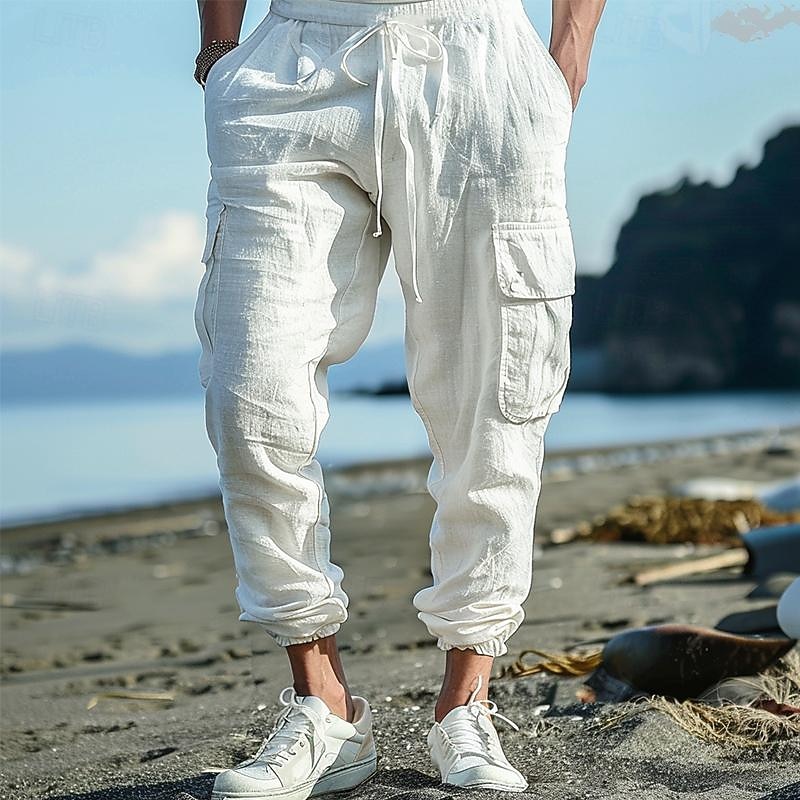 More information about Men's Cargo Pants Linen Pants Trousers Summer Pants Beach Pants Drawstring Elastic Waist Multi Pocket Plain Comfort Breathable Full Length Casual Daily Holiday Fashion Classic Style Black White
