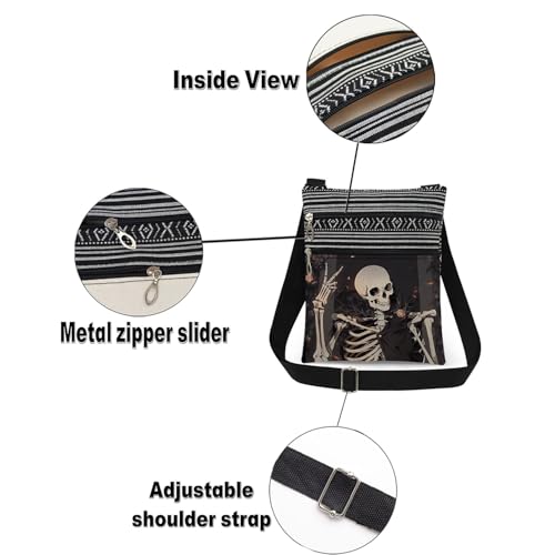 Closure type: ZipperLining: PolyesterItem Display Dimensions: 32.68 x 7.48 inches1. 【Material】The Skeleton crossbody bag is made of polyester fiber, offering lightweight, durability, softness, and easy cleaning. It features high-quality metal zippers that glide smoothly.2. 【Dimensions】The Skeleton crossbody bag measures 9.25×7.48×0.4 inches (23.5×19×1 cm) and weighs 0.143 lbs (65 g). The adjustable shoulder strap length ranges from 12.6 to 24.1 inches (32–62 cm). Note: Minor variations may occur due to handmade craftsmanship.3. 【Design】The Skeleton crossbody bag uses heat transfer printing technology for fade-resistant patterns. The irregular black-and-white stripes are crafted with a woven process, and their placement varies randomly (positions may differ slightly due to hand-cutting). The dual-pocket design helps efficiently organize different items, while the adjustable strap accommodates most users.4. 【Functionality】The Skeleton crossbody bag perfectly holds small personal belongings like phones, keys, wallets, coins, cosmetics, tissues, and hygiene pads.5. 【Usage Scenarios】Ideal for daily use, commuting, travel, gatherings, shopping, or holidays. It also makes a thoughtful gift for friends and family. Perfect for everyday use. superior materials and excellent craftsmanship ensure long-lasting durability.