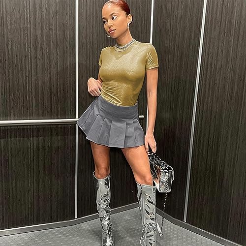 • FEATURES: This crop top features silvery metallic appearance, short sleeve, mock neck and midriff-baring details. Slim and short style T-shirts show off your best figure.