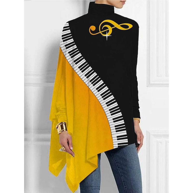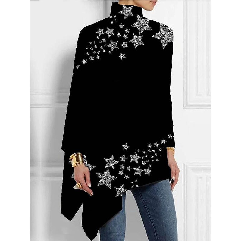 Highlights [Fabric] : Crafted from a lightweight and micro-elastic polyester, this women's top offers comfort and breathability, making it perfect for the transitional seasons of spring and fall. The fabric features a striking 3D print, adding texture and visual interest. [Fit] : Designed in a regular fit, this plus-size blouse provides a comfortable and relaxed wear, ensuring ease of movement and a flattering silhouette. The long sleeves and high neckline offer additional coverage for cooler days, while maintaining a chic and polished look. [Design Highlights] : The blouse showcases a high-contrast butterfly and star print, adding a whimsical touch to your wardrobe. The asymmetrical hemline contributes a modern flair, and the turtleneck design elevates the overall sophistication of the piece, while the absence of lining keeps it lightweight. [Occasions] : Ideal for casual outings and semi-formal events alike, this versatile top is perfect for a variety of settings. Whether you're heading to a weekend gathering or enjoying a relaxed day at home, this blouse can be effortlessly paired with jeans or trousers for a stylish appearance. [Size Range] : Available in a wide range of sizes from S to 4XL, this top caters to various body types, ensuring a perfect fit for everyone. Whether you prefer a more fitted look or a looser silhouette, this blouse adapts to your style needs.