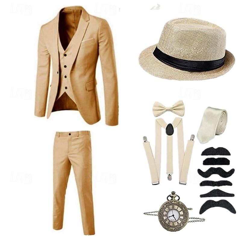 HOT ! Vintage Roaring 20s 1920s Outfits Suits & Blazers Accesories Set The Great Gatsby Gentleman Solid Color Halloween V Neck Fancy Dress Men's Halloween Halloween Bachelorette Party Adults' Cravat Coat