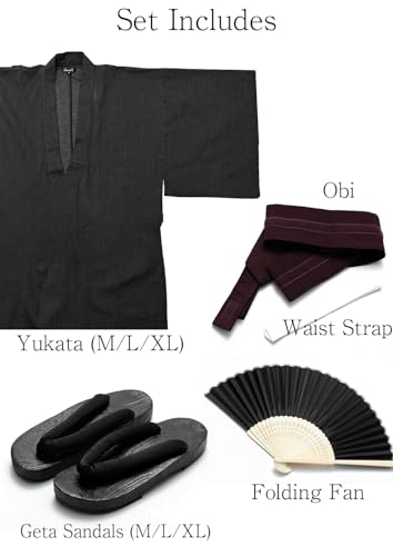 HOT ! Men's Traditional Cotton Yukata 5-Piece Set (Yukata, Geta, Obi, Waist Strap, Fan) – Easy to Wear