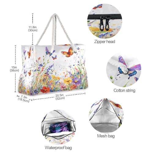 Wildflowers Butterflies Beach Bag & Travel Tote Bag Large Sandproof with Zipper Closure, Wet Pouch for Swim Gym Travel, Lightweight Foldable Outdoor Bag 4