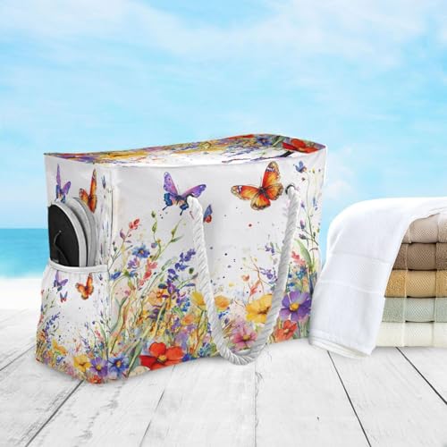 HOT ! Wildflowers Butterflies Beach Bag & Travel Tote Bag Large Sandproof with Zipper Closure, Wet Pouch for Swim Gym Travel, Lightweight Foldable Outdoor Bag