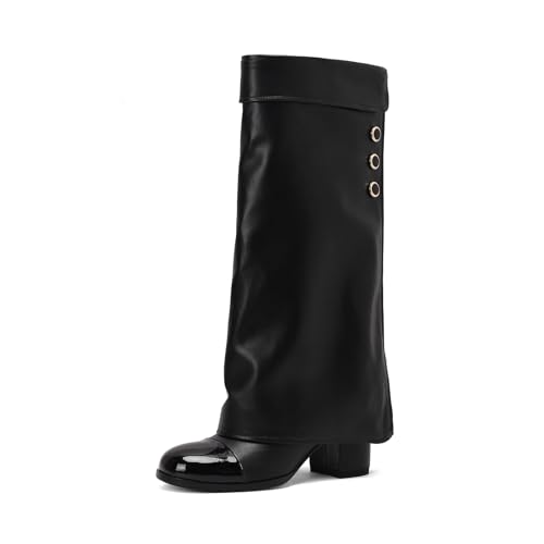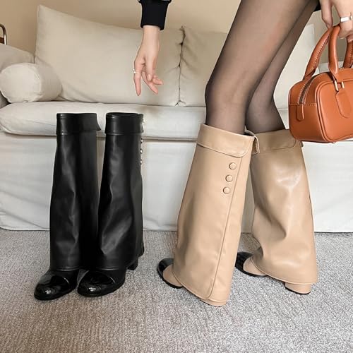 More information about Knee high boot womens Fold Over black suede boots for women Round Toe tan Chunky heels Pull on Booties wide calf boots dressy botas
