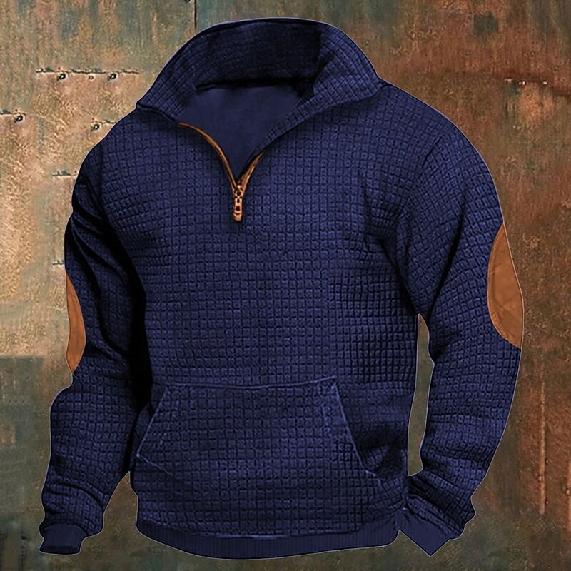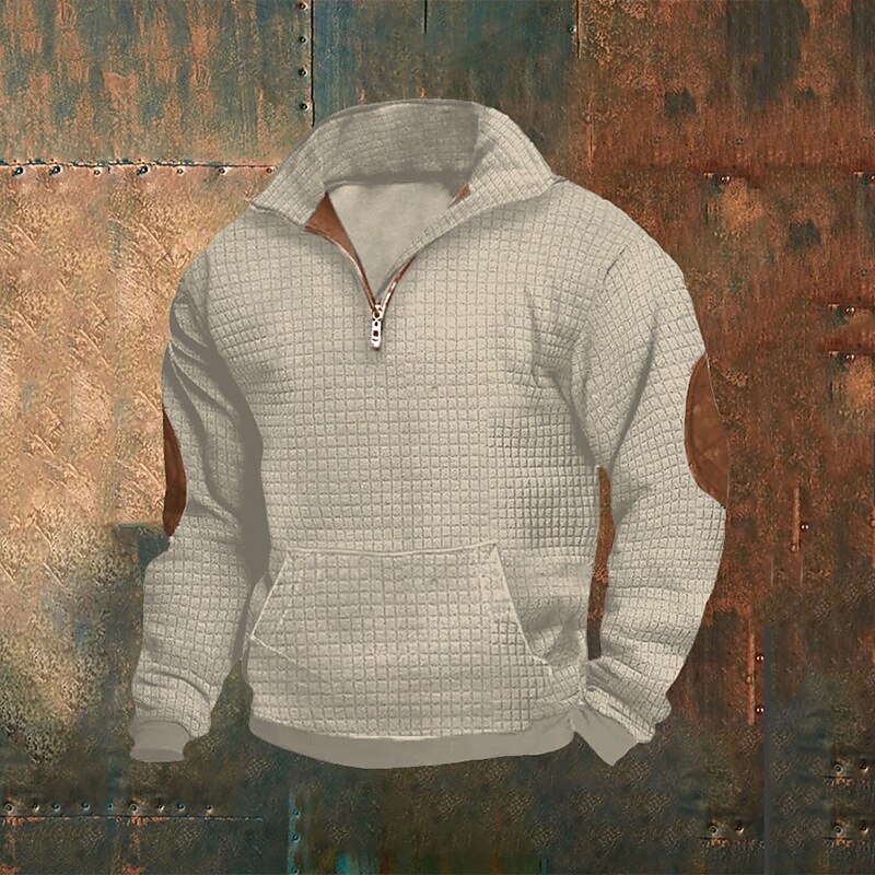 Highlights [Fabric] Crafted from high-quality polyester, this Men's Waffle Sweatshirt is designed for comfort and warmth. The waffle-knit texture adds a stylish touch, making it perfect for those cool spring and fall days. [Fit Type] Featuring a regular fit, this pullover sweatshirt offers enough room for layered clothing underneath, ensuring you stay warm and comfortable in various weather conditions. [Design Highlights] The sweatshirt boasts a practical half-zip neckline that provides adjustable ventilation. It includes long sleeves with ribbed cuffs for a snug fit and enhanced warmth. The color block pattern and patchwork elbow designs add a trendy and rugged element, while the large front kangaroo pocket offers both style and functionality. [Occasions] This versatile sweatshirt is ideal for a range of activities, from casual daily wear to sports and outdoor adventures. Whether you're heading out for a holiday, a casual outing, or a streetwear look, this sweatshirt complements any casual wardrobe effortlessly. [Size Notice] Available in sizes S, M, L, XL, 2XL, and 3XL, ensuring a comfortable fit for a variety of body types. Choose the size that best suits your preference and enjoy the perfect blend of style and practicality.