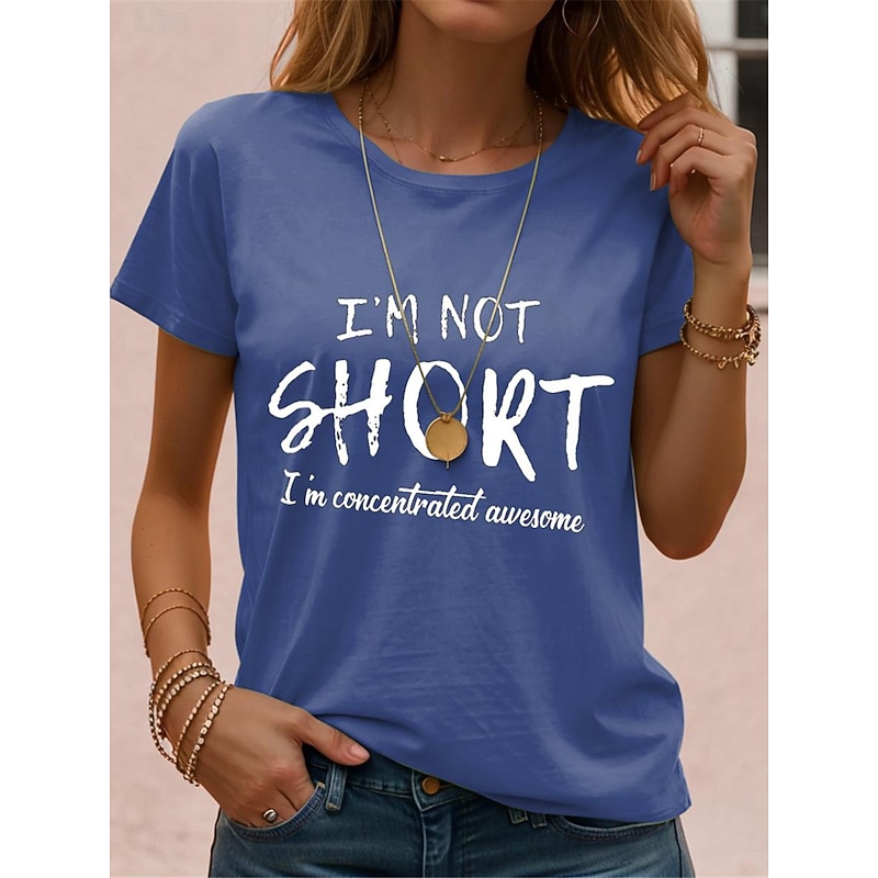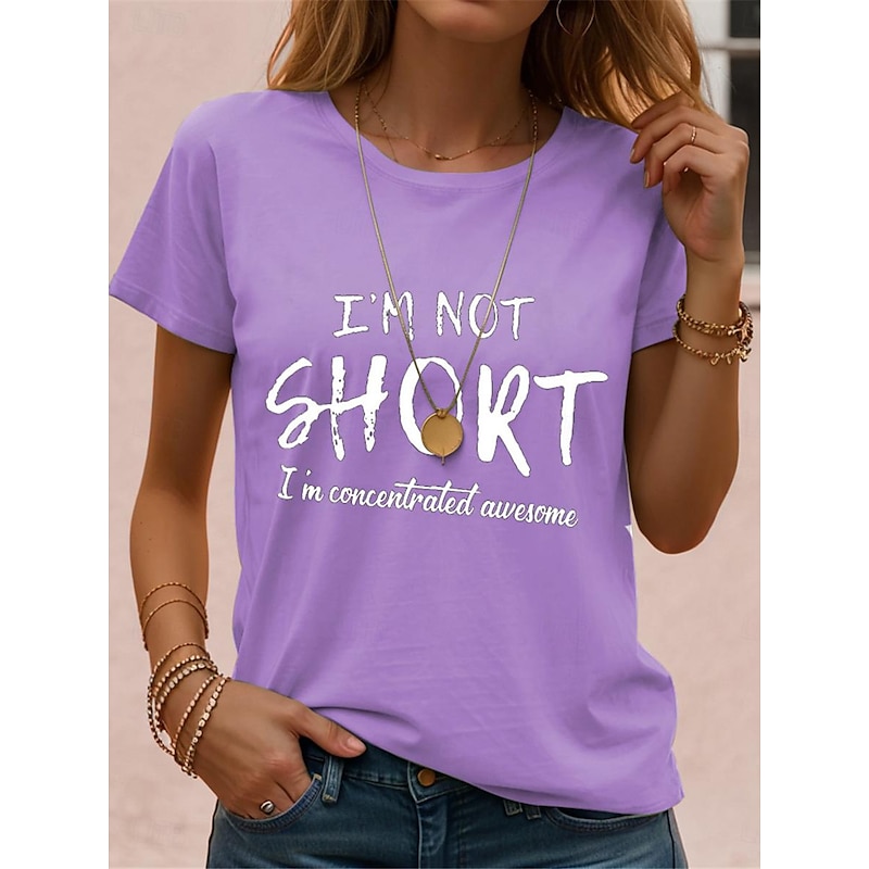 The standout design of this T-shirt features a playful and empowering bold white text print on the front, "I'm not SHORT, I'm concentrated awesome," adding a touch of humor and personality to your wardrobe. Available in versatile colors like Navy Blue, Purple, and Black, it provides plenty of options for matching with different styles.