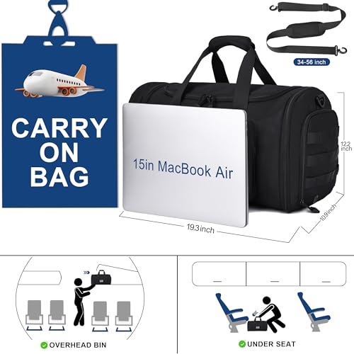 Expandable Capacity (38L - 45L): Measuring 19.3 (L) x 12.2 (W) x 10.9 (H), this carry-on bag expands to 22.9 in length via dual side expansion zippers. Designed to meet airline carry-on requirements, it effortlessly transitions from a compact weekender to a spacious travel companion for both short trips and extended journeys.Premium & solid Construction: Crafted from water-resistant heavy-duty nylon with corrosion-resistant hardware, the bag combines rugged durability with refined aesthetics. Featuring YKK zippers and a durable MOLLE-compatible fabric, it's versatile enough for use as a weekender, overnight bag, carry-on, camping gear, business duffel, gym bag, or casual daily accessory.Multi-Pocket Organization: Features a well-organized interior with one large main compartment and a secure zippered pocket. The exterior includes a dedicated shoe compartment, a side zippered pocket, and two front zippered pockets. Its high capacity easily accommodates 15-inch laptops, iPads, clothing, shoes, and daily essentials for versatile travel.Dedicated & Ventilated Shoe Compartment: Includes an internal end-pouch/shoe compartment to organize footwear and clothing separately, keeping clothes clean. This ventilated side compartment features exclusive air vents and can also function as a dirty laundry compartment.Exquisite Travel-Friendly Details: Offers three carrying options: sturdy round-stitched handles, a padded adjustable (detachable) shoulder strap, and crossbody functionality. Four reinforced anti-abrasion base pads enhance durability and protect against dirt/wear. A back-mounted luggage sleeve allows seamless attachment to rolling suitcases, reducing physical strain during transit.