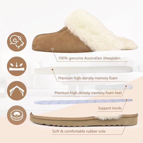 FANTURE Genuine Australian Sheepskin Women Slippers, Memory Foam Fluffy Shearling Slippers Indoor Outdoor House Shoes with Warm Lining 5