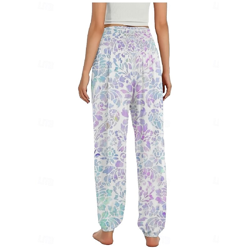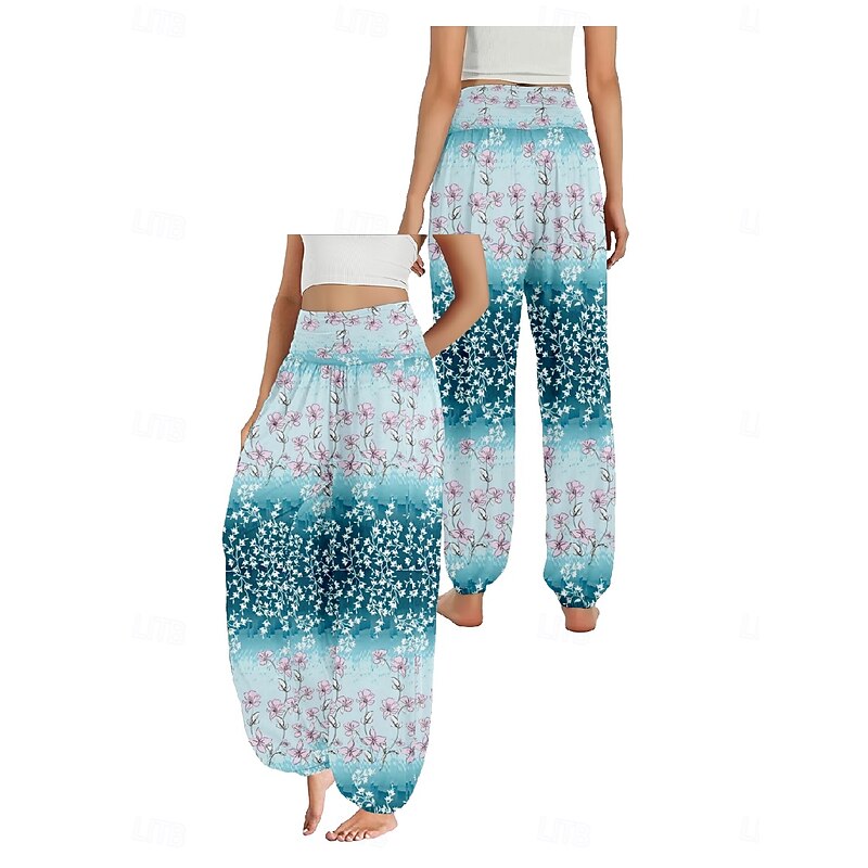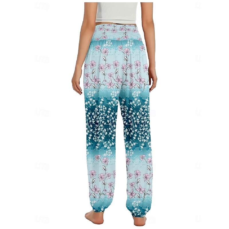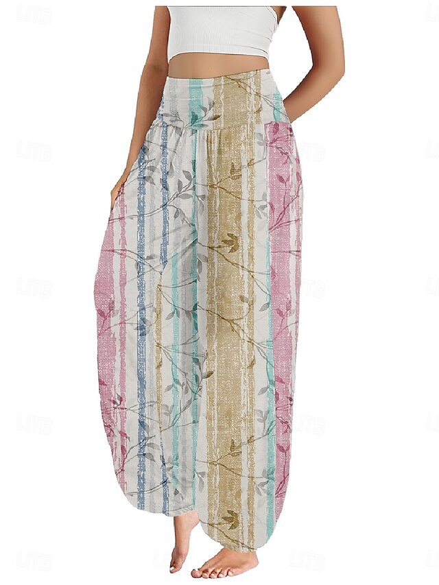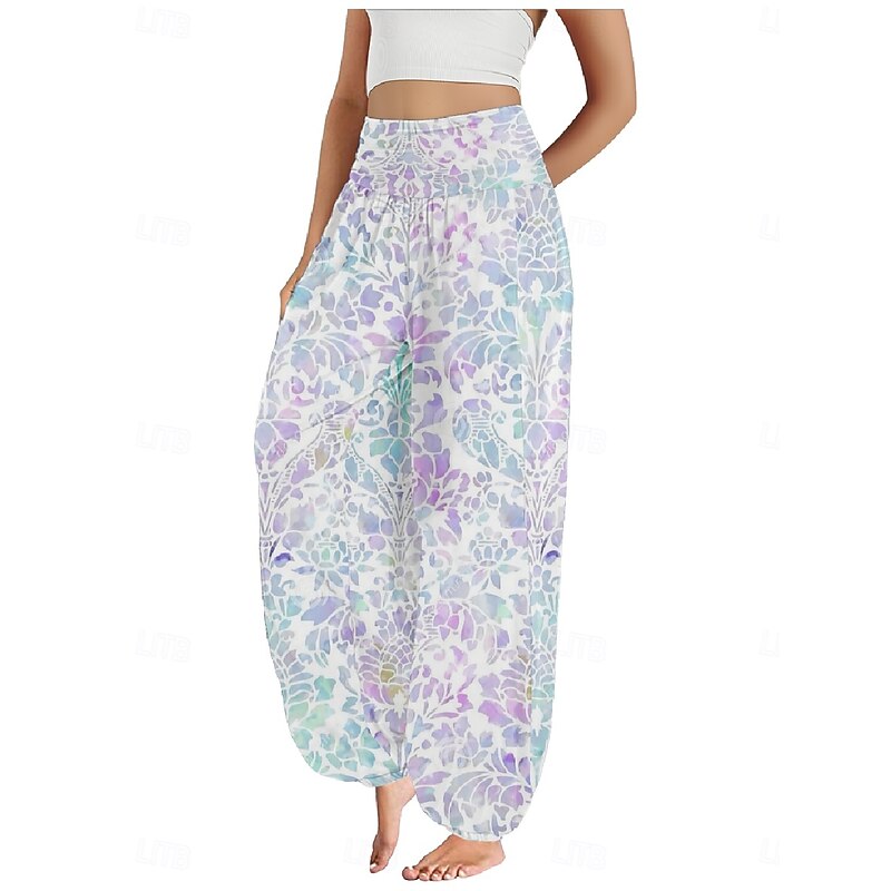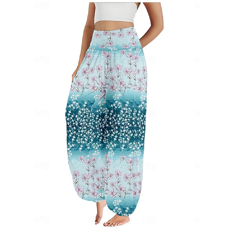 Women's Linen-Inspired Pants Wide Leg Pants Trousers Ethnic Style Casual Boho Full Length High Waist Floral Pocket Elastic Waist Printing Breathability smooth Micro-elastic Outdoor Yoga Pink Royal Blue