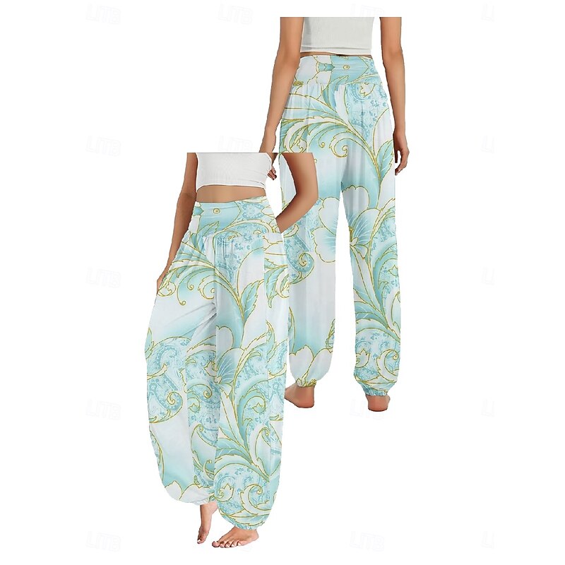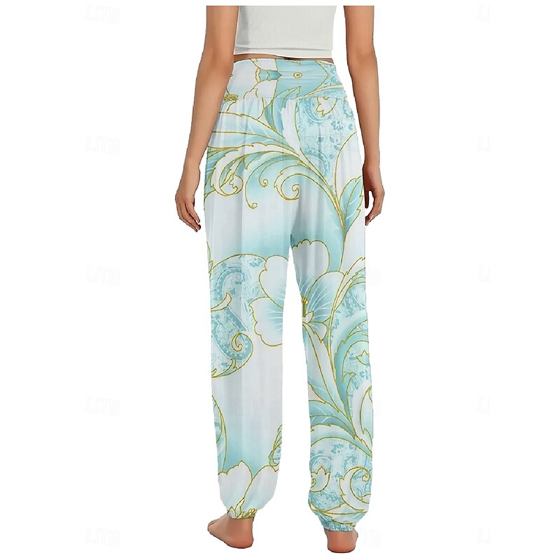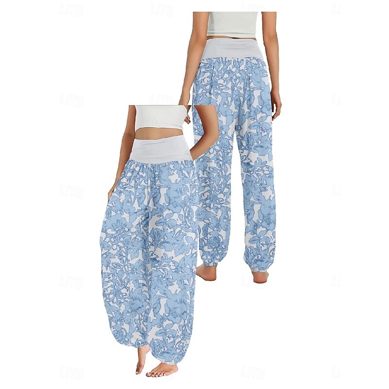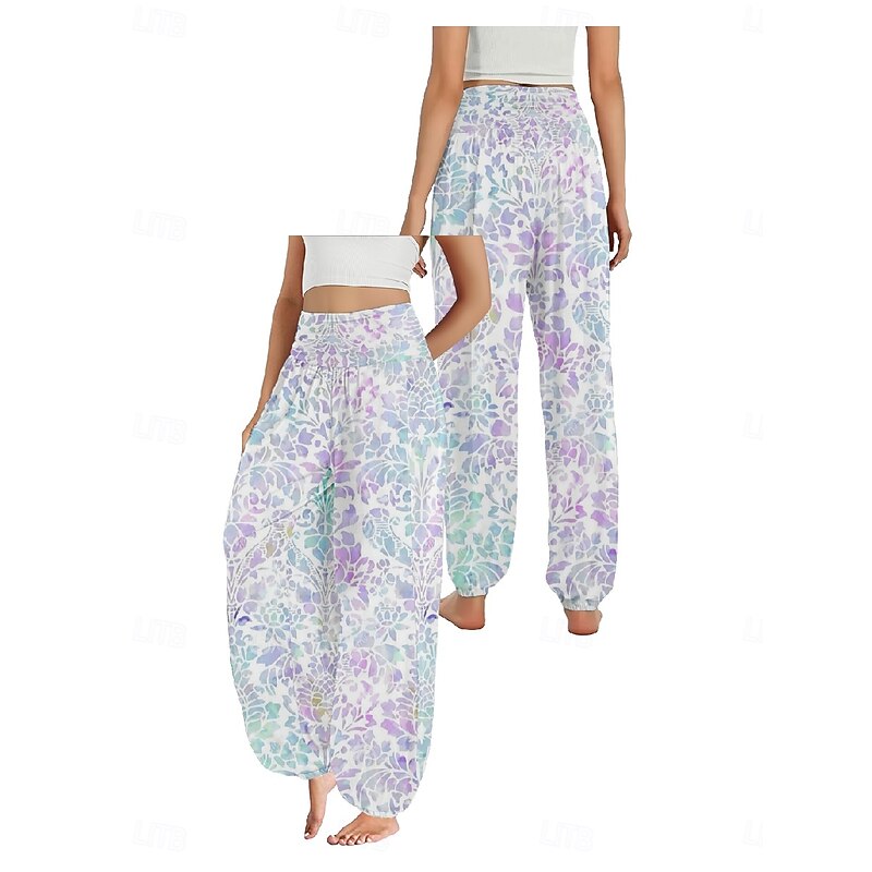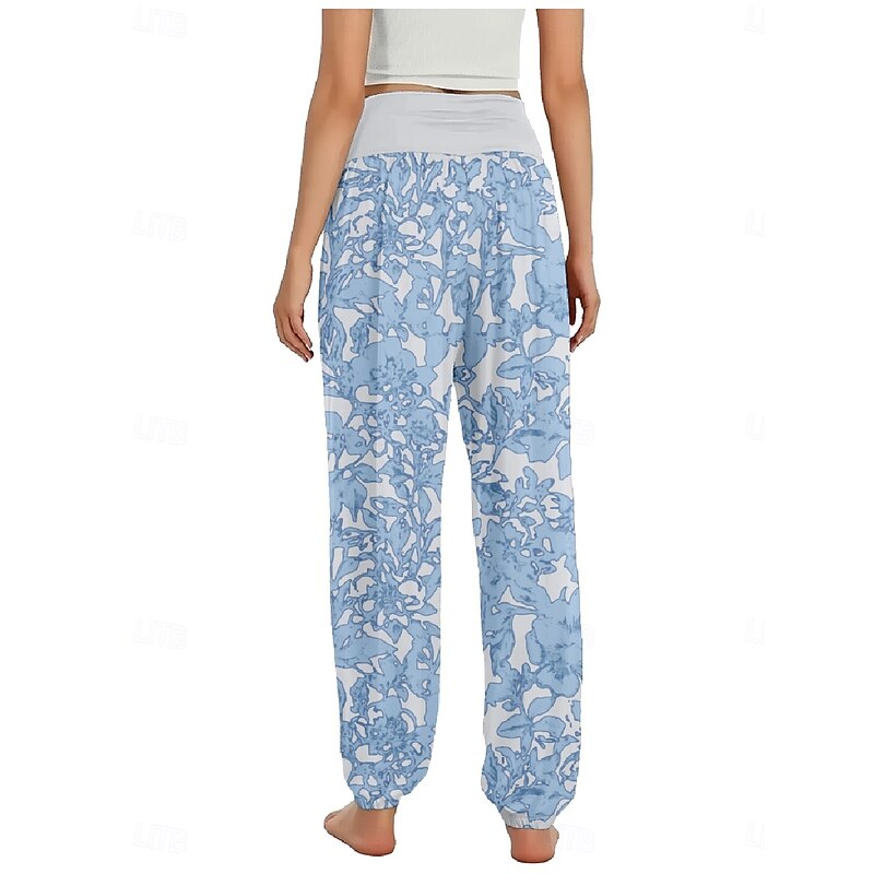 Women's Linen-Inspired Pants Wide Leg Pants Trousers Ethnic Style Casual Boho Full Length High Waist Floral Pocket Elastic Waist Printing Breathability smooth Micro-elastic Outdoor Yoga Pink Royal Blue