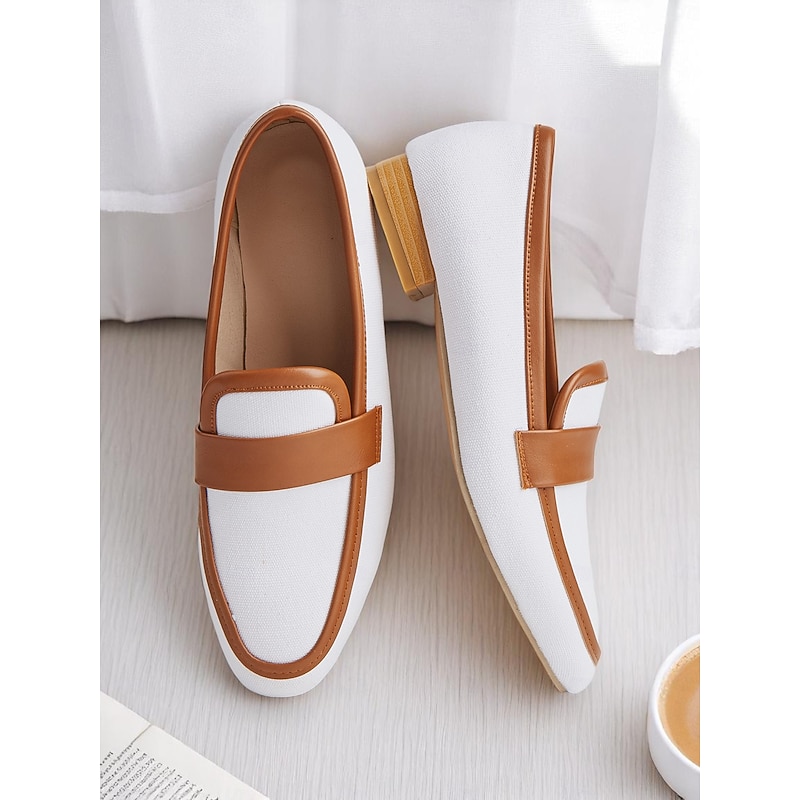 HOT ! Women's Canvas Penny Loafers – White and Brown Low Heel Office Flats for Work and Daily Commute