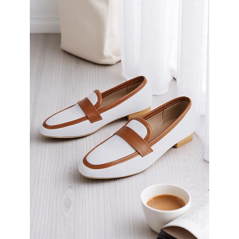 More information about Women's Canvas Penny Loafers – White and Brown Low Heel Office Flats for Work and Daily Commute