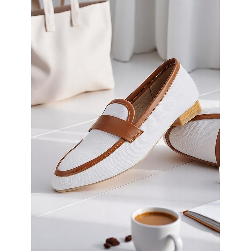 Women's Canvas Penny Loafers – White and Brown Low Heel Office Flats for Work and Daily Commute 7