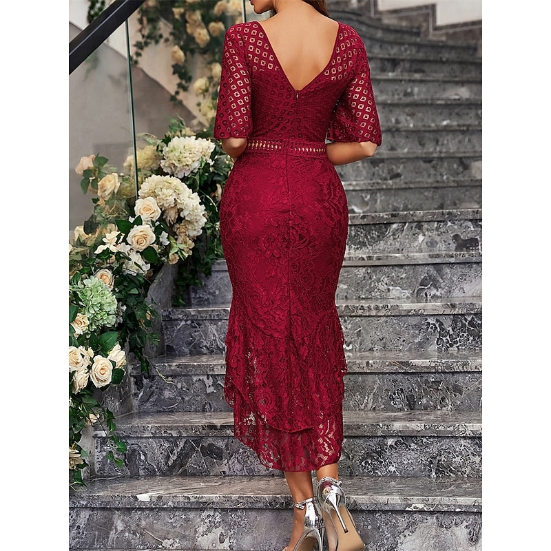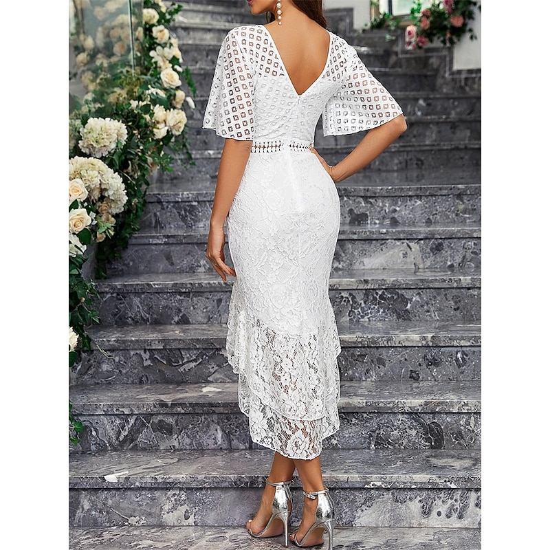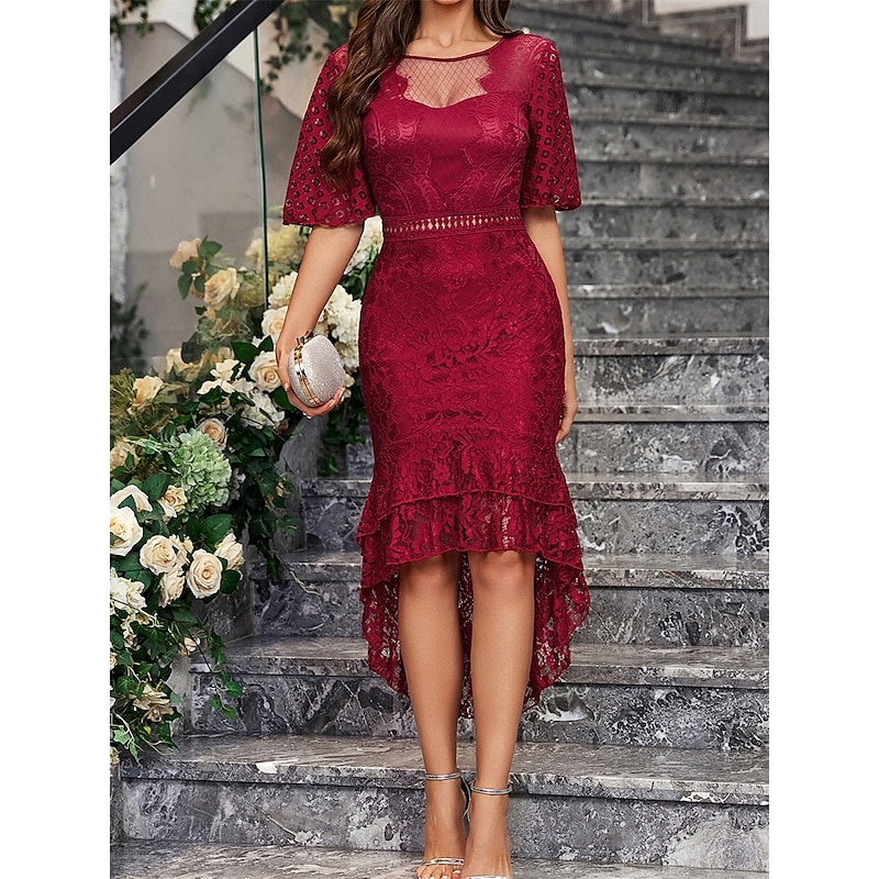 More information about Dress Mother of the Bride Dress Elegant Party Simple Crew Neck Asymmetrical Spandex Short Sleeve with Lace