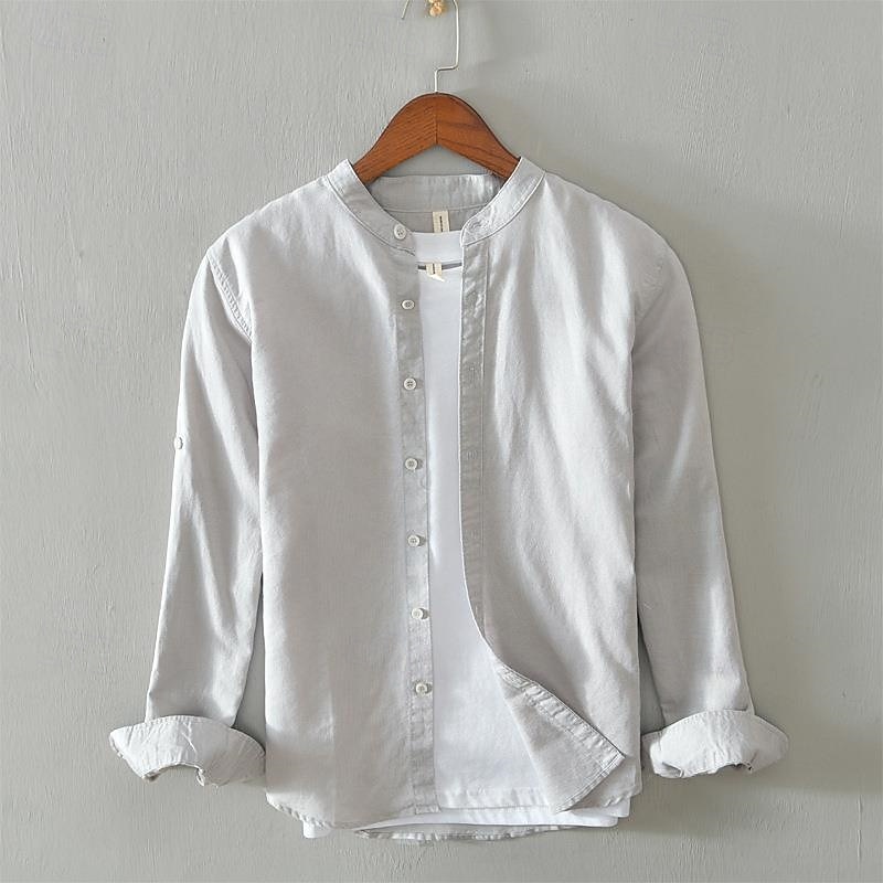 Men's Shirt Linen Shirt Casual Shirt Button Up Shirt Cotton Shirt Plain Vacation Hawaiian White Navy Blue Khaki Gray Long Sleeve Grandad Collar Spring Fall Clothing Apparel Button-Down 9