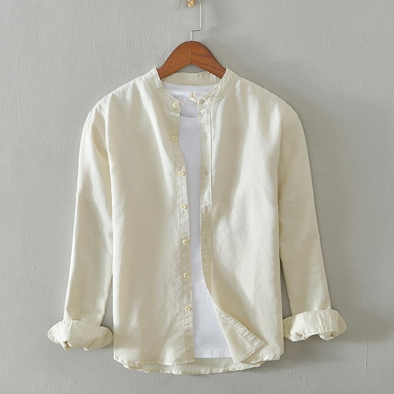 HOT ! Men's Shirt Linen Shirt Casual Shirt Button Up Shirt Cotton Shirt Plain Vacation Hawaiian White Navy Blue Khaki Gray Long Sleeve Grandad Collar Spring Fall Clothing Apparel Button-Down