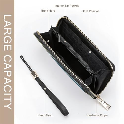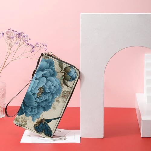 Blue Peony And Butterfly Vintage PU Leather Clutch Long Bifold Wallet, Coin Purse Credit Pass Case, robust Card-Holder Money Storage for Women Men