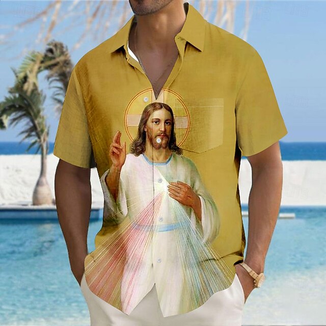 More information about Easter Men's Jesus Relief Pattern Shirt Button Up Shirt Short Sleeve Vintage Retro Holiday Festival Summer Turndown 3D Print Collared Shirts Front One Pocket Yellow