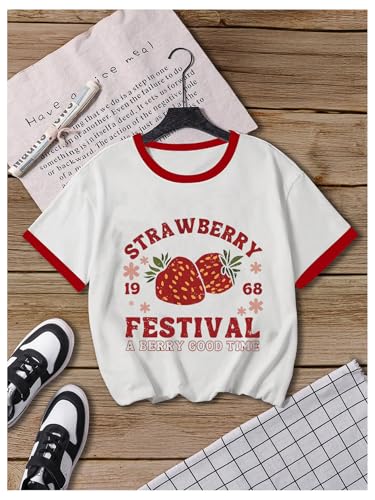 Fabric type: 95% Polyester, 5% ElastaneCare instructions: Machine WashOrigin: ImportedClosure type: Pull OnFabric: Made from a breathable and lightweight fabric blend that feels plush against the skin, offering comfort for all-day wearFeatures: Summer cute tee shirt for girls, contrast binding, strawberry and letter print, short sleeve, loose-fitOccasions: Ideal for outdoor adventures, such as going out with friends, shopping, family outings, park, picnic, playdates, going out for a walk, casual wear and so onStyling Options: Pair this cute tee shirt with denim shorts, skorts, loose pants, flare pants, sweatpants, cargo pants, joggers or cute skirtSize: Please check our size info in the product description below or the last picture before ordering