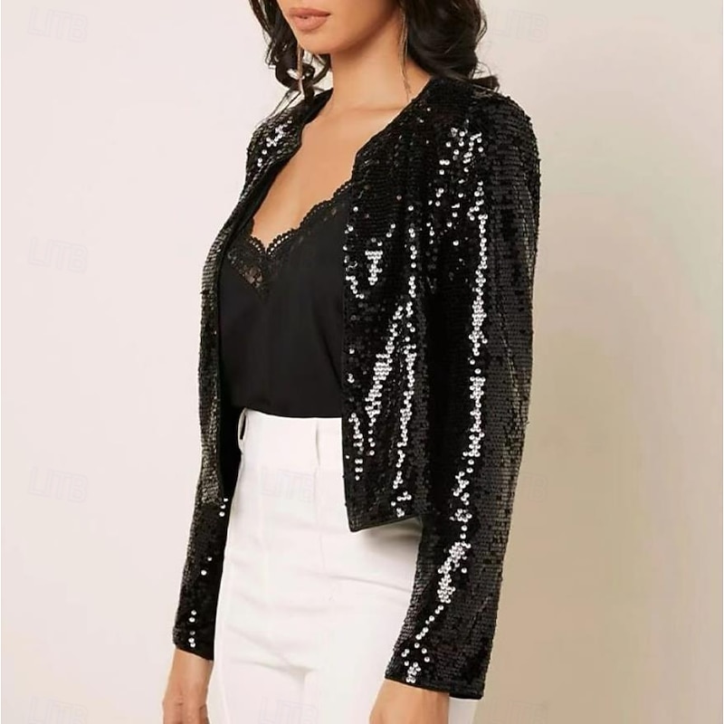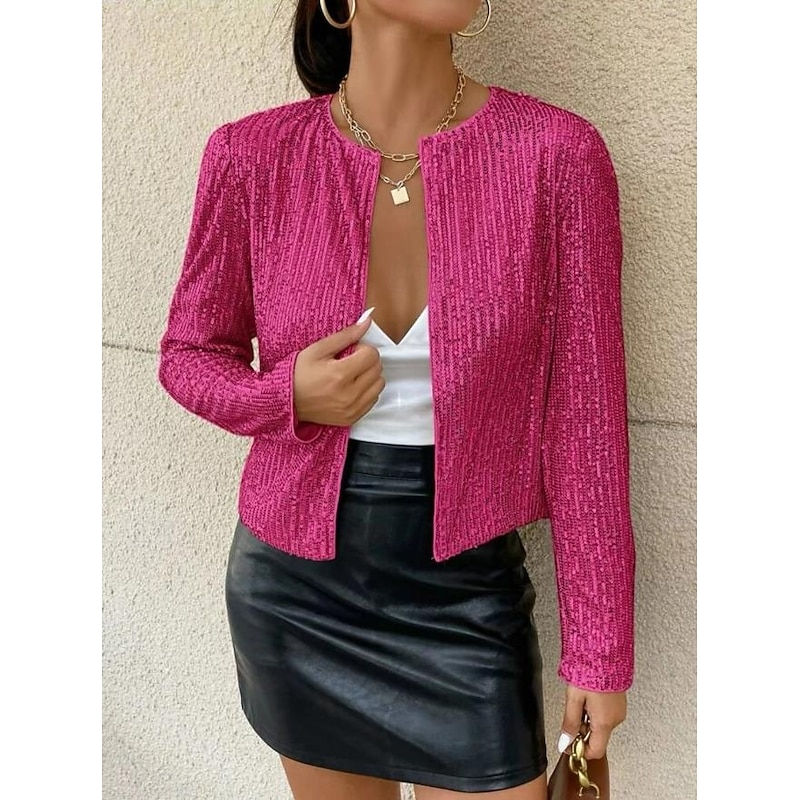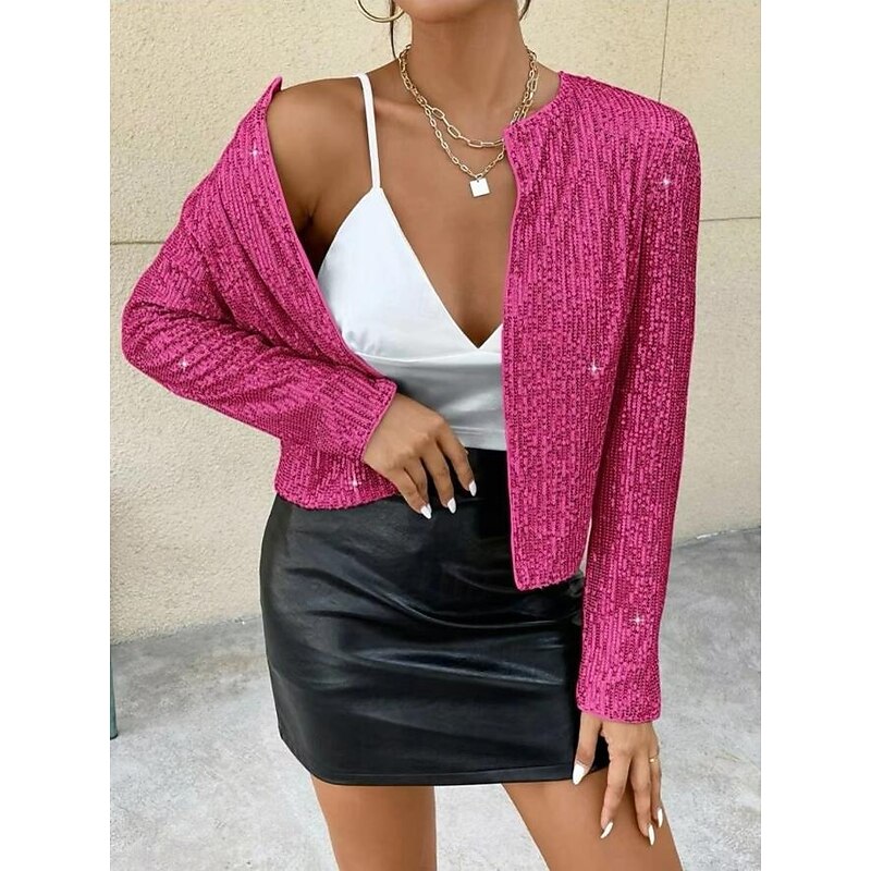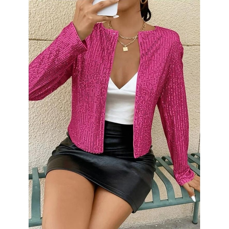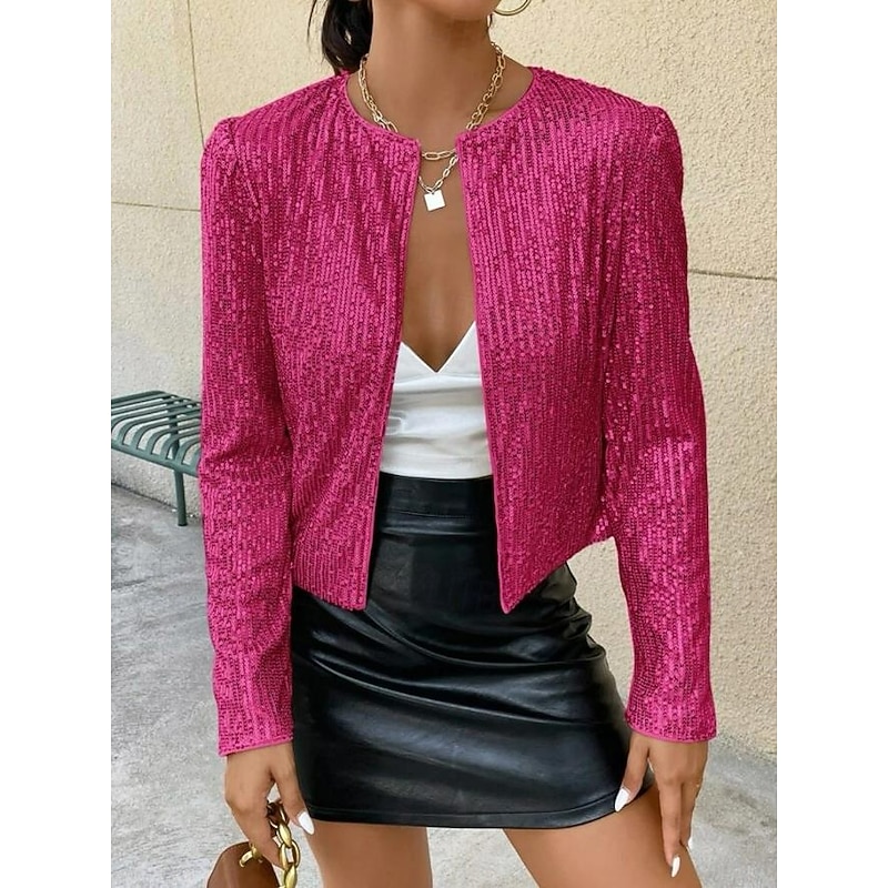 Highlights [Fabric]: This women’s casual jacket is made from high-quality polyester, offering both durability and comfort. The stretchy fabric ensures a flattering fit and ease of movement, making it perfect for daily wear. [Fit]: With its regular fit design, this jacket provides a comfortable yet chic silhouette. The open front adds to its sleek and modern style, making it easy to layer over various outfits. [Design Highlights]: Adorned with shimmering rose gold sequins, this jacket is a statement piece that exudes glamour and sophistication. The crewneck and T-shirt style sleeves add a contemporary touch, while the solid color pattern keeps it versatile and elegant. [Occasions]: Ideal for spring and fall seasons, this jacket is perfect for daily wear and going out. Whether paired with jeans for a casual day out or dressed up with a skirt for a more formal event, it adds a stylish edge to any ensemble. [Size Range]: Available in a range of sizes from S to XXL, this jacket caters to a variety of body types, ensuring everyone can find their perfect fit.