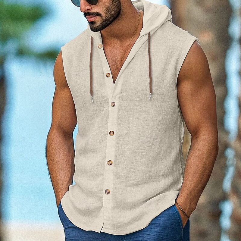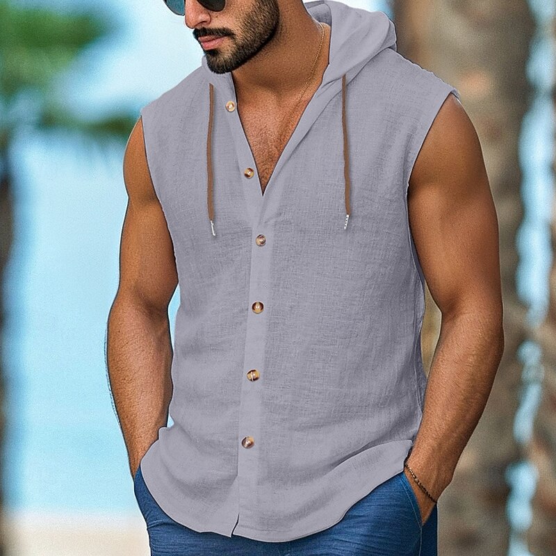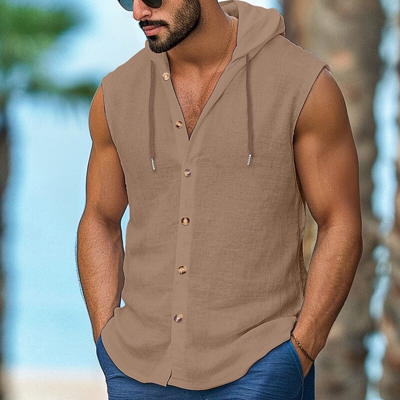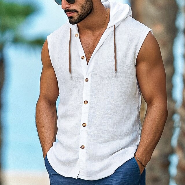 More information about Men's Shirt Linen Shirt Casual Shirt Button Up Shirt Untucked Shirts Plain Vacation Street Black White Navy Blue Brown Sleeveless Hooded Summer Clothing Apparel Adjustable Drawstring Hood