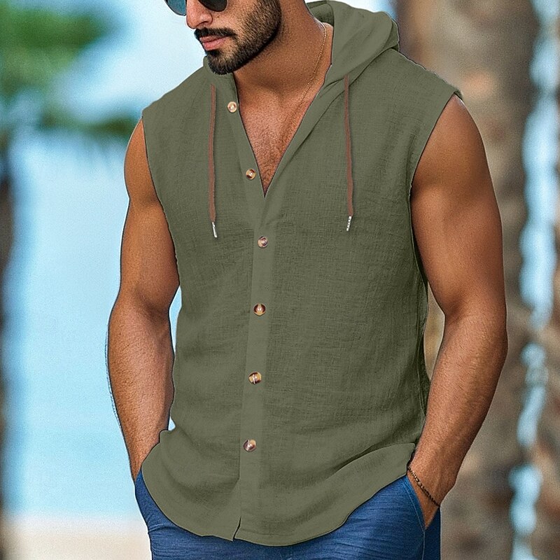 HOT ! Men's Shirt Linen Shirt Casual Shirt Button Up Shirt Untucked Shirts Plain Vacation Street Black White Navy Blue Brown Sleeveless Hooded Summer Clothing Apparel Adjustable Drawstring Hood