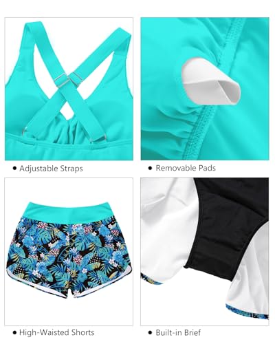 • Tankini bathing Suit: This two piece tankini features a V-neck twist front, adjustable crisscross straps, removable pads, and high waist swim shorts—offering flattering style.
