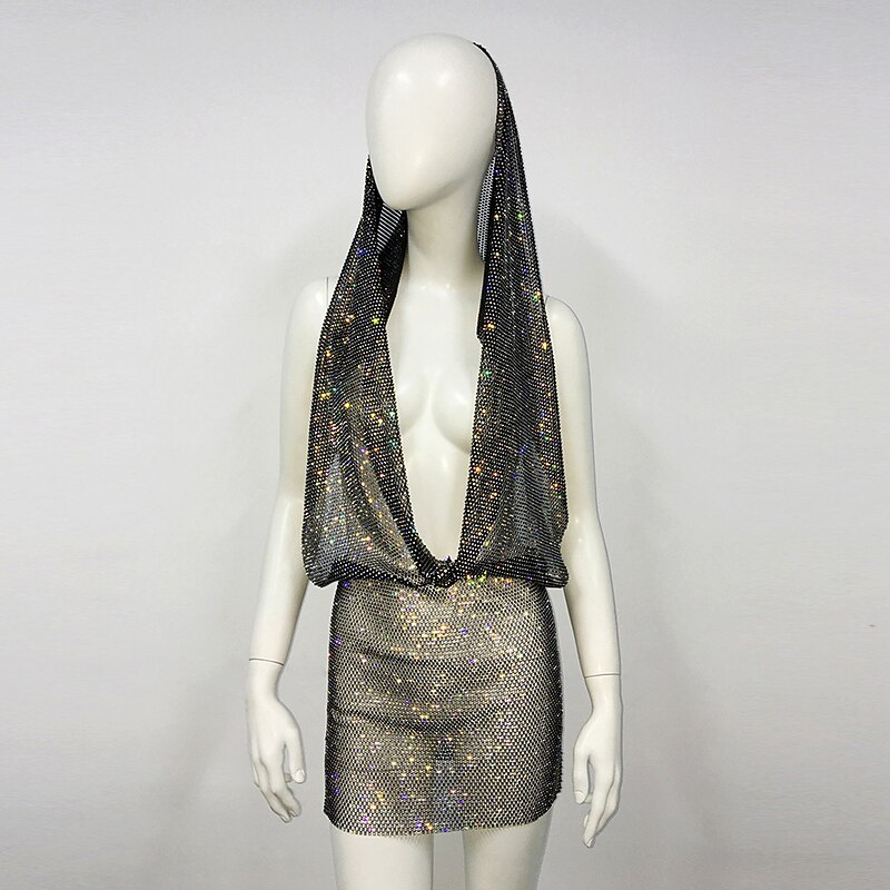HOT ! Metallic Backless Sparkle Mini Dress Disco Solid Color Deep V Fancy Dress Women's Carnival Party Club Dress